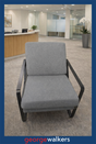 Material and Durability: Grey fabric upholstery with sturdy steel/metal armrests and leg frame,