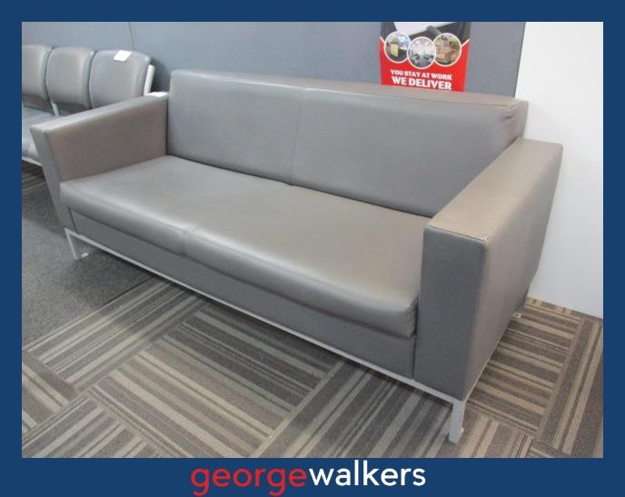 For sale is a commercial-grade grey vinyl sofa/couch, perfect for offices, waiting rooms, breakout spaces, or reception areas.
