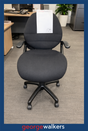 Ergonomic office chairs designed by John Leal. Black fabric upholstery with armrests and dual lever adjustment for height and tilt. Ideal for professional offices or home workspaces.